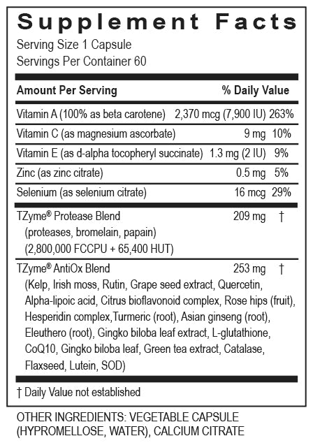 - TZyme® Protease Blend (209 mg) – Protease, bromelain, and papain for muscle and tissue support*